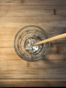 - For a starter of 10 grams. Crumble (scissors might be handy) the starter and mix it (optional with clean hand) with approximately 20 grams of fresh warm water (max 35 °C).