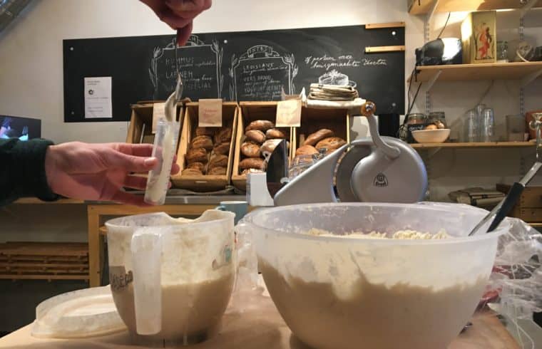 Luuk van Ooijen, student aan AIMMS (Vrije Universiteit) neemt op 11 december 2019 monsters van onze desemcultuur die is ontwikkeld bij verschillende waterconcentraties en temperaturen. Achterin de desembroden, gefermenteerd met deze cultuur.